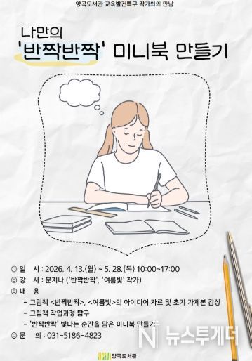뉴스투게더 김인숙 기자 | 김포시 양곡도서관은 2026년 교육발전특구 사업의 일환으로 4월 13일부터 5월 28일까지 관내 초등학생을 위한 스트레스 관리 프로그램 '나만의 ‘반짝반짝’ 미니북 만들기'를 운영한다.