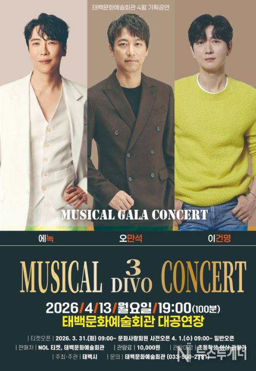 태백문화예술회관 관계자는 “대한민국을 대표하는 뮤지컬 배우들이 한 무대에서 펼치는 특별한 갈라 콘서트”라며 “시민들이 뮤지컬의 매력을 가까이에서 느낄 수 있는 뜻깊은 공연이 될 것으로 기대한다”고 말했다.