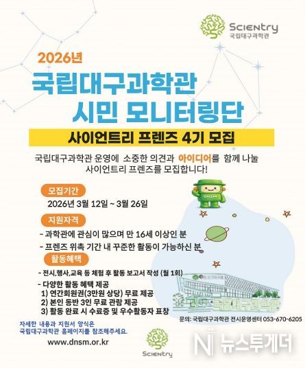 이번 국립대구과학관 사이언트리 프렌즈 4기 모집은 3월 12일부터 3월 26일까지 진행되며, 대구·경북 지역 대학생 및 시민을 대상으로 15명 내외로 선발할 예정이다.