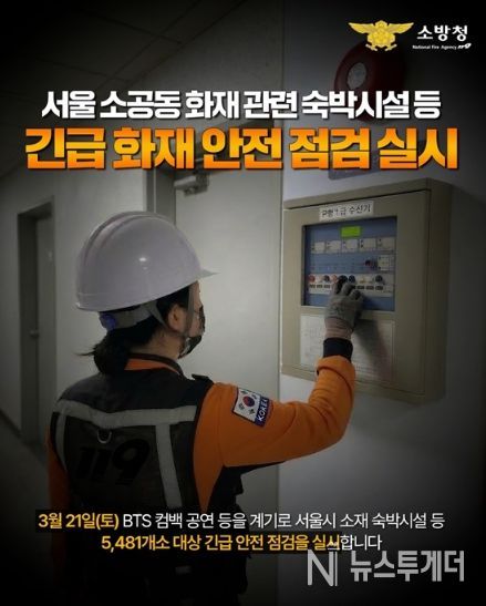 3월 21일(토) BTS 컴백 공연 등을 계기로 서울시 소재 숙박시설 등 5481개소 대상 긴급 안전점검을 실시합니다.