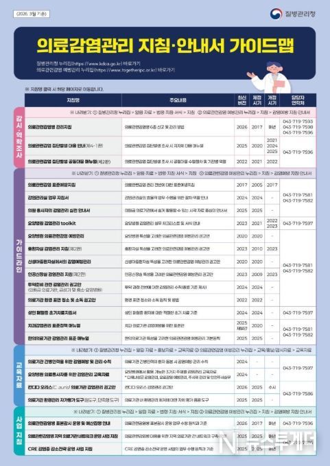 뉴스투게더 김인숙 기자 | 질병관리청은 의료기관 현장에서 활용할 수 있는 '의료감염관리 지침·안내서 가이드맵'을 제작·배포한다.