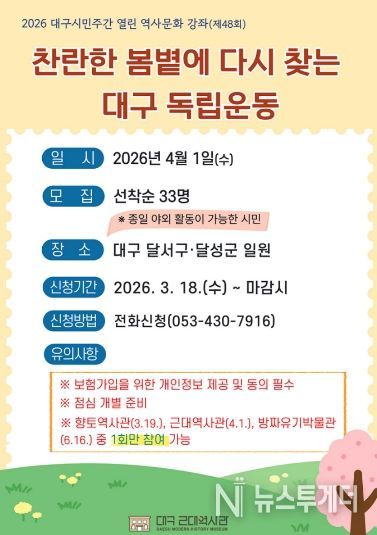 뉴스투게더 김인숙 기자 | (재)대구문화예술진흥원 박물관운영본부 소속 대구근대역사관은 2026 대구시민주간 연계행사로 4월 1일 대구시 달서구와 달성군 일원의 대구 독립운동가와 문화유산을 찾아보는 ‘찬란한 봄볕에 다시 찾는 대구 독립운동’ 답사를 개최하며, 참가자를 모집한다.