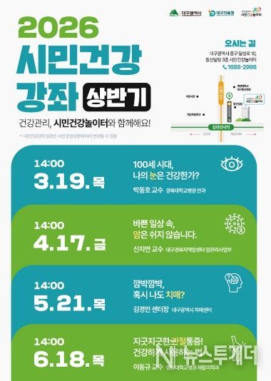 뉴스투게더 김인숙 기자 | 대구광역시 시민건강놀이터는 시민들의 건강관리 실천력 강화를 위해 ‘2026년 시민건강강좌’를 운영한다. 3월 19일 첫 강좌를 시작으로 시민건강놀이터 건강콘서트홀에서 연간 8회에 걸쳐 개최할 예정이다.