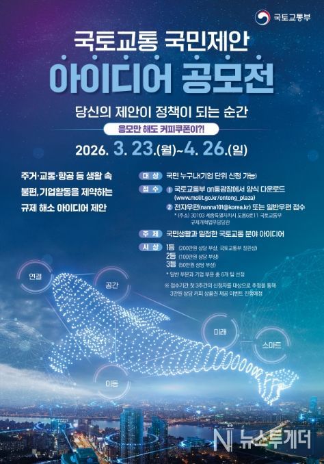 뉴스투게더 김태훈 기자 | 국토교통부는 국민 생활과 밀접한 국토교통 분야 아이디어를 발굴하고 국민이 체감하는 규제개선을 추진하기 위해'국토교통 국민제안 아이디어 공모전'을 3월 23일부터 4월 26일까지 5주간 개최한다고 밝혔다.