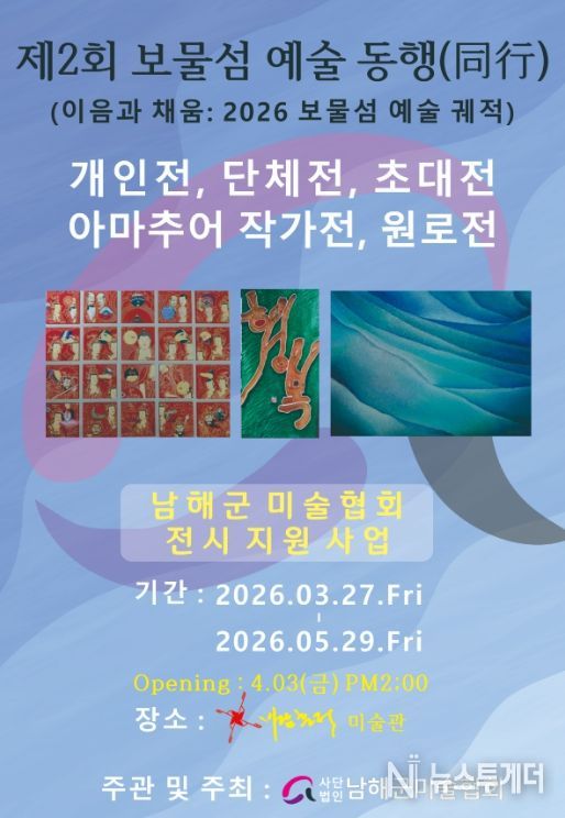 남해군 미술협회 이동기 회장은 ”지난해 첫선을 보인 ‘보물섬 예술 동행’이 군민들의 큰 호응을 얻었던 만큼, 올해는 더욱 내실 있는 구성으로 준비했다”며 “13개 팀이 저마다의 색깔로 그려낼 이번 전시가 남해군이 문화예술 도시로 한 단계 더 도약하는 계기가 되길 바란다”라고 말했다.
