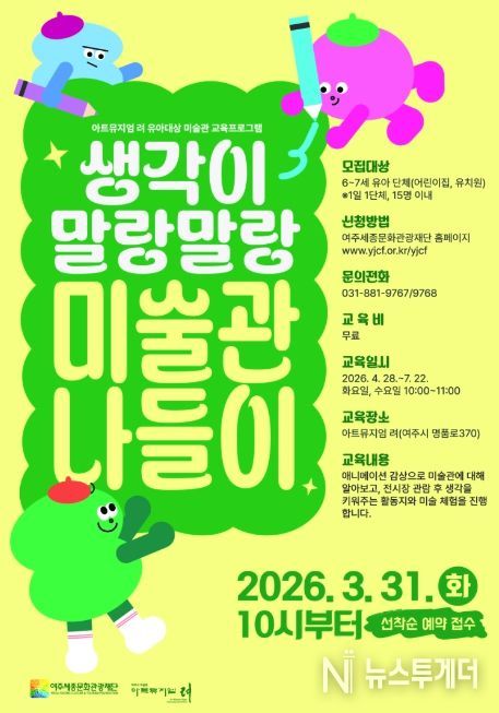 뉴스투게더 김인숙 기자 | 여주세종문화관광재단은 유아를 대상으로 하는 미술관 교육프로그램 '생각이 말랑말랑, 미술관 나들이'를 오는 4월부터 10월까지 아트뮤지엄 려에서 운영한다고 밝혔다.
