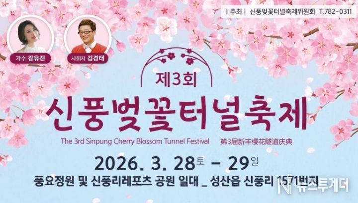 뉴스투게더 김인숙 기자 | 서귀포시는 몸과 마음이 가벼워지는 따스한 봄, 가족・연인・친구 간의 잊지 못할 추억을 선사할 제3회 신풍벚꽃터널축제가 28일~29일 양일간 성산읍 풍요정원 및 신풍리레포츠 공원 일원에서 개최된다고 밝혔다.