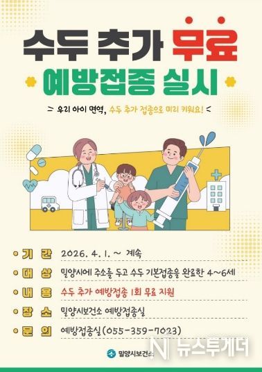뉴스투게더 김인숙 기자 | 경남 밀양시는 봄철 수두 유행에 대응해 아동 건강 보호를 위해 전국 최초로 수두 추가 예방접종 사업을 시행한다고 25일 밝혔다.