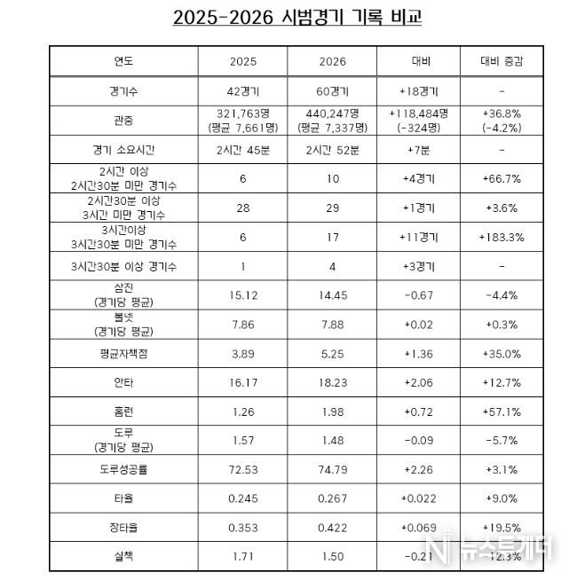 경기 평균 소요 시간은 2시간 52분으로 2025년 대비 7분 늘었으며, 경기당 삼진은 14.45개, 볼넷은 7.88개로 각각 4.4% 감소, 0.3% 증가를 기록했다. 평균자책점은 지난해 3.89에서 5.25로 높아져 35.0%의 증가 폭을 보였다.