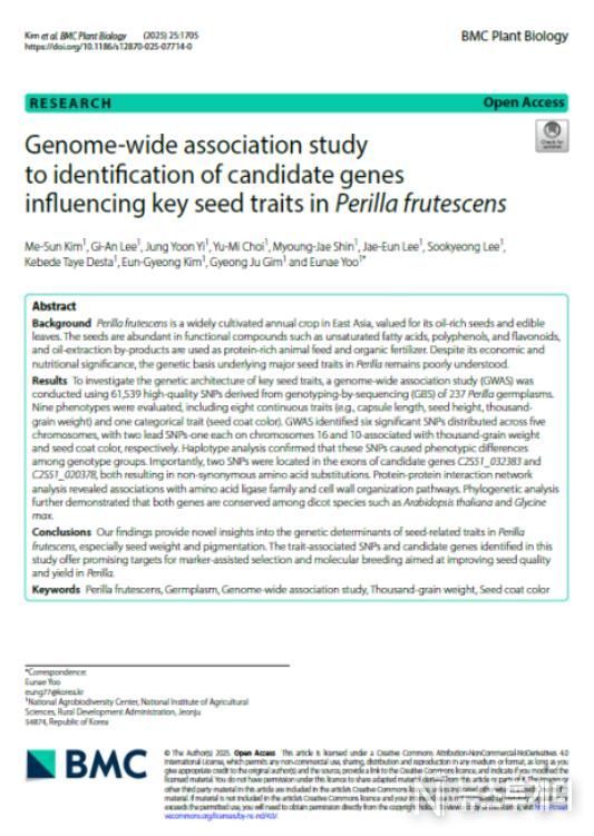 이번 연구 결과는 국제학술지 ‘BMC Plant Biology’(IF 4.8)에 논문으로 게재됐다. 앞으로 고품질 들깨 품종과 기능성 자원 개발, 분자표지 개발 등에 활용될 것으로 기대된다.