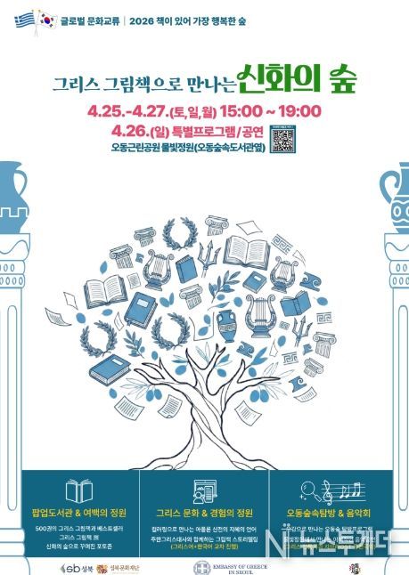 행사장 전역에는 ▲500여 권의 도서를 갖춘 ‘팝업도서관’ ▲숲속에서 감상하는 ‘그리스 그림책展’ ▲신화 속 장면을 재현한 ‘포토존’이 운영된다. 특히 고대 그리스 아폴론 신전의 델픽 격언을 배우는 ‘지혜의 언어 컬러링’과 ‘그리스 알파벳 스탬프 체험’은 어린이들이 고대 그리스 문화를 친숙하게 접할 수 있는 기회를 제공할 예정이다.