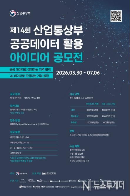 뉴스투게더 김태훈 기자 | 산업통상부는 산업기술시험원 등 산하 공공기관과 함께 3월 30일∼7월 6일까지 '제14회 공공데이터 활용 아이디어 공모전'을 개최한다.