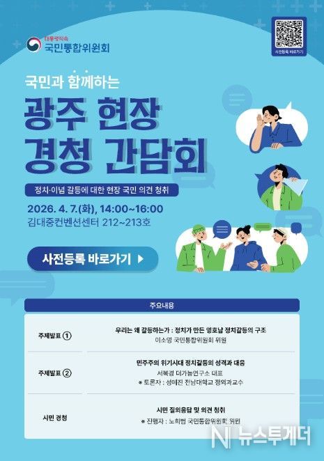 뉴스투게더 김태훈 기자 | 대통령직속 국민통합위원회는 4월 7일 오후 2시부터 김대중컨벤션센터(광주 서구)에서 ‘국민과 함께하는 광주 현장 경청 간담회’를 개최한다.