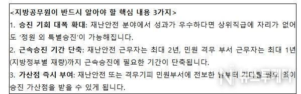 근속 승진 기회도 단축된다. 특히 재난안전 분야에서 2년 이상 근무한 공무원의 경우, 현재 1년까지 단축 가능한 근속승진 기간을 최대 2년까지 단축할 수 있도록 의무화했다.