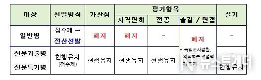 이는 군 복무에 전문성을 요하지 않는 일반병 입대를 위해 불필요한 자격증 취득 등 ‘과도한 스펙 경쟁’으로 이어져 병역이행을 준비하는 청년들의 사회적 ·경제적 비용을 과다 발생시키는 문제점이 있었다. 이를 개선하기 위해 병무청은 국방부 ·공군과 협의를 거쳐 자격 ·면허 ·전공과 상관없이 누구나 지원이 가능한 공군 일반병을 블라인드 방식의 무작위 선발로 변경한다. 다만, 공군 전문기술병과 전문특기병은 군 임무 특수성과 전문성 등을 감안하여 현행대로 점수제 선발 방식을 유지하기로 했다.
