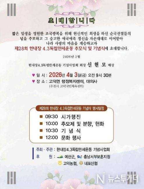뉴스투게더 김인숙 기자 | 예산군은 4월 3일 고덕면 한내장터 일원에서 ‘제28회 한내장 4·3 독립만세운동 기념행사’를 개최한다고 밝혔다.