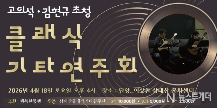 뉴스투게더 김인숙 기자 | 단양군 어상천 지역에서 활동하는 삼태산 클래식기타 합주단은 공연기획단체 행복한 동행(대표 홍원의)과 함께 오는 18일 오후 4시 어상천 삼태산문화센터에서 ‘고의석·김현규 초청 클래식기타 연주회’를 개최한다.