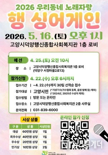 노래자랑은 고양시에 거주하는 시민이라면 누구나 지원이 가능하며 오는 22일까지 온오프라인 중 편한 방법으로 신청하면 된다. 온라인은 관련 링크로 접속해 신청하고 되고, 오프라인은 행신종합사회복지관 2층 사무실에 방문해 신청서류(이름, 주소, 신청곡 등)를 작성·제출하면 된다.