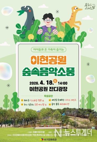 하현주 서구문화회관 관장은“화창한 봄날에 아이들의 상상력과 웃음꽃이 피어나는 이현공원에서 다채로운 공연 소풍을 즐기시길 바란다.”라고 전했다.