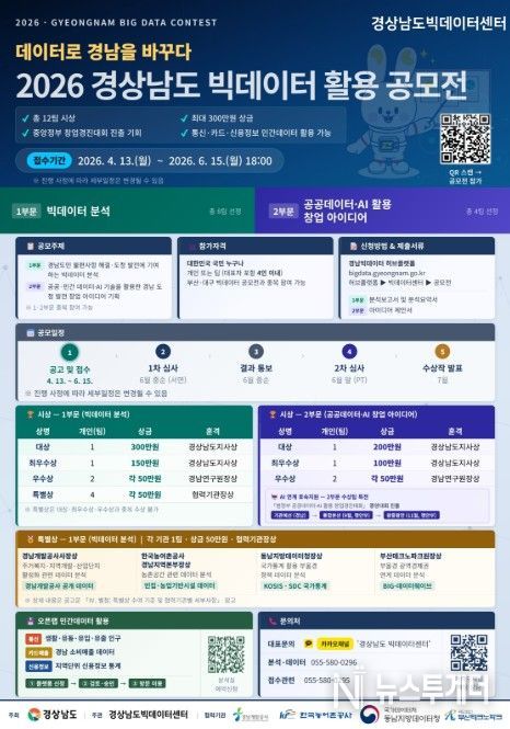 뉴스투게더 김인숙 기자 | 경상남도 빅데이터센터는 도민 생활 속 불편을 해결하고 데이터 기반 정책 아이디어와 혁신 창업 모델을 발굴하기 위해 ‘2026년 경상남도 빅데이터 활용 공모전’을 개최한다.