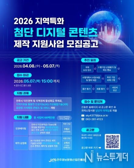 뉴스투게더 김인숙 기자 | 전주정보문화산업진흥원은 인공지능(AI)과 가상융합기술(XR)을 전주 고유의 문화·역사 자산과 결합하는 ‘지역특화 첨단 디지털 콘텐츠 제작 지원 사업’에 참여할 기업을 모집한다고 13일 밝혔다.