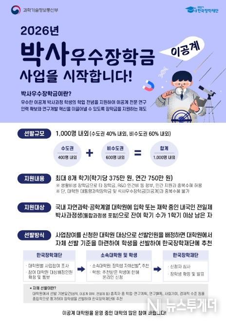 뉴스투게더 김태훈 기자 | 과학기술정보통신부와 한국장학재단은 2026년도 이공계 박사 우수장학금 사업을 올해 처음으로 시행한다고 밝혔다. 이공계 박사 우수장학금은 사업 참여를 신청한 대학원의 소속 학생 중 장학생을 선발하며, 대학원의 사업 참여 신청 기간은 4월 14일부터 4월 20일까지이다.