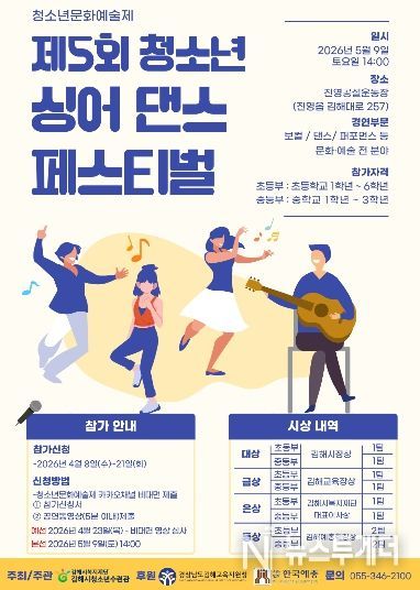 뉴스투게더 김인숙 기자 | (재)김해시복지재단(대표이사 임주택) 청소년수련관은 오는 5월 9일(토) 오후 2시부터 4시까지 진영운동장에서 청소년의 달을 맞아 ‘제5회 싱어댄스 페스티벌’을 개최한다고 밝혔다.