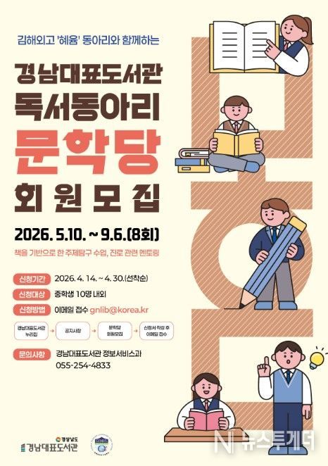 강순익 경남대표도서관장은 “청소년들이 또래와 함께 책을 읽고 생각을 나누며 진로까지 고민해 볼 수 있는 의미 있는 시간이 될 것”이라며 “독서와 멘토링에 관심 있는 중학생들의 많은 참여를 바란다”고 말했다.