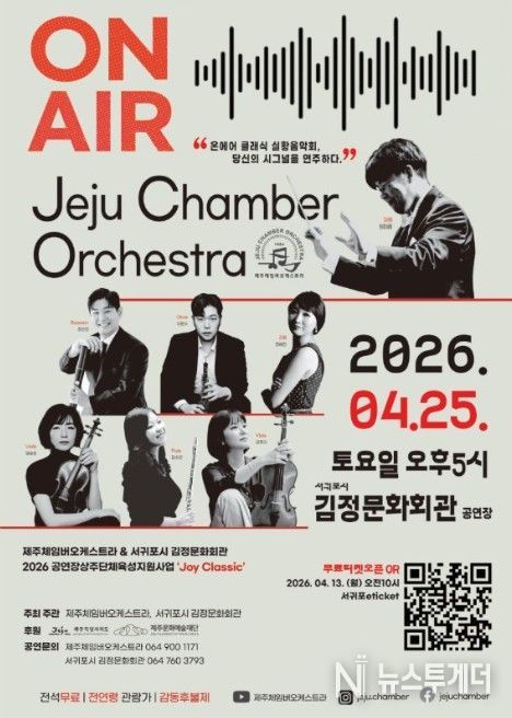 뉴스투게더 김인숙 기자 | 서귀포시는 2026년 공연장 상주단체 육성지원 사업의 일환으로 제주체임버오케스트라의 공연 '온 에어'를 4월 25일 오후 5시에 김정문화회관에서 개최한다고 밝혔다.