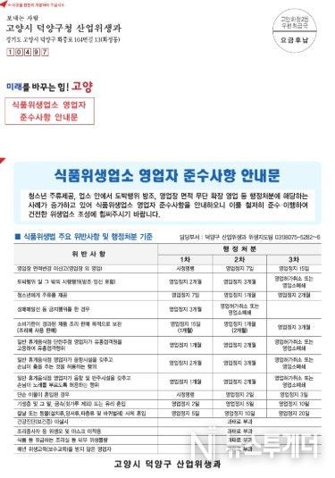 덕양구 관계자는 “이번 안내문 배부를 통해 식품위생법 주요 위반사항과 변경된 규정을 적극 안내하고, 영업자의 위생관리 역량을 높이고자 한다”며 “기온 상승으로 식중독 발생 위험이 높아지는 시기인 만큼 예방 수칙 홍보를 병행해 안전한 식품위생 환경 조성에 최선을 다하겠다”고 밝혔다.