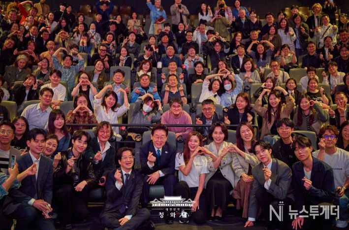 무대 인사를 마치고 사진 촬영을 원하는 관객들의 요청에 이 대통령 부부는 다시 객석 1열에 앉아 손하트를 하며 전체 관객과 단체사진을 촬영했다.