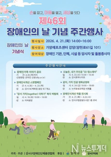 뉴스투게더 김인숙 기자 | 서울 강서구는 4월 20일 장애인의 날을 맞아, 오는 18일부터 일주일간 ‘제46회 장애인의 날 기념 주간행사’를 개최한다고 밝혔다.