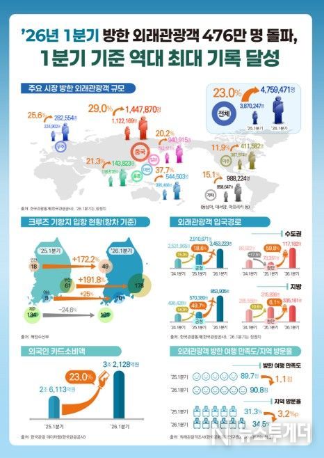 뉴스투게더 윤종우 기자 | 문화체육관광부는 올해 1분기(1~3월) 한국을 방문한 외국인 관광객이 약 476만 명을 기록하며, 3월 중동사태 발생에도 불구하고 1분기 기준 역대 최대 규모를 달성했다고 밝혔다. 이는 2025년 같은 기간 대비 23% 증가한 수치이며, 특히 3월에는 외래객 약 206만 명이 방한해 월별 기준으로도 최대 실적을 경신했다. ‘케이-컬처’의 세계적 인기와 더불어 민관의 적극적인 외래관광객 유치 노력이 결실을 본 것으로 분석된다.