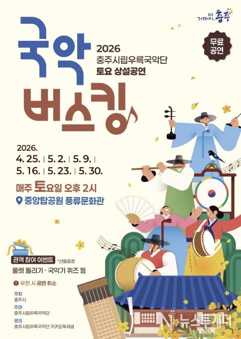 충주시립우륵국악단은 오는 4월 25일부터 5월 30일까지 매주 토요일 오후 2시, 중앙탑면 풍류문화관에서 2026 상반기 토요상설 공연인 ‘국악버스킹’을 개최한다고 밝혔다.