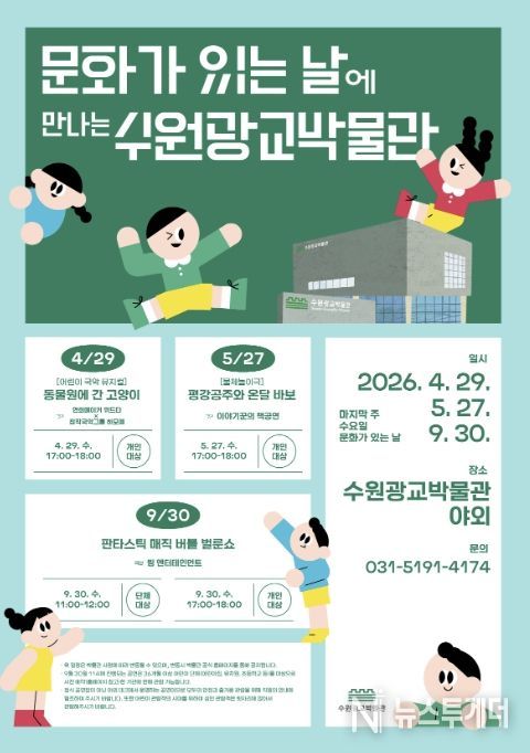 뉴스투게더 김인숙 기자 | 수원광교박물관은 4·5·9월 ‘문화가 있는 날’(매달 마지막 주 수요일)에 박물관 야외에서 어린이와 가족 관람객을 위한 무료 공연을 연다.