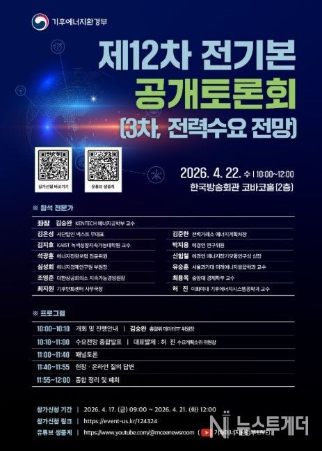 기후에너지환경부와 12차 전기본 수립 총괄위원회는 4월 22일 10시부터 서울 양천구 소재 한국방송회관 코바코홀(2층)에서 3차 대국민 정책토론회를 개최한다고 밝혔다.
