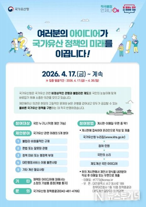 뉴스투게더 윤종우 기자 | 국가유산청은 국가유산 관련 비정상적인 관행과 불합리한 제도를 바로잡기 위한 정상화 과제를 발굴하고자 17일부터 국민들의 참신한 아이디어를 받는다.