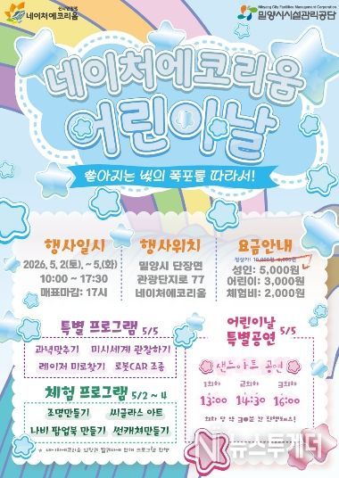뉴스투게더 김인숙 기자 | 밀양시시설관리공단(이사장 김경민)은 오는 5월 2일부터 5일까지 어린이날을 맞아 선샤인 밀양 테마파크 내 네이처에코리움에서 가족 단위 방문객을 위한 ‘제3회 네이처에코리움 어린이날 행사’를 개최한다.