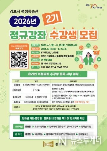뉴스투게더 김인숙 기자 | 김포시가 시민의 평생학습 참여 기회를 확대하고 변화하는 사회 환경에 대응할 수 있는 역량 강화를 위해 ‘2026년 2기 평생교육 정규강좌’ 수강생을 모집한다고 밝혔다.