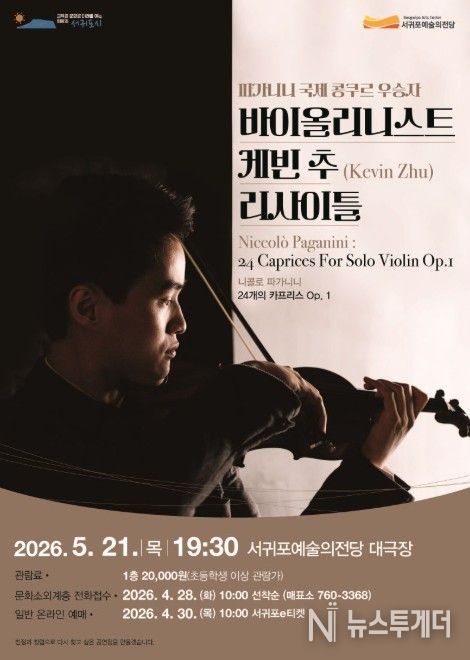뉴스투게더 김인숙 기자 | 서귀포예술의전당은 세계 정상급 젊은 연주자를 소개하는 ‘2026 국제콩쿠르 위너스 콘서트 시리즈’의 첫 무대로 ‘파가니니 바이올린 콩쿠르 위너스 콘서트’를 5월 21일 저녁 7시 30분 대극장에서 개최한다.