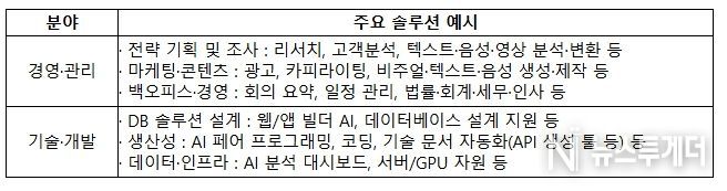 국내 유망 AI 벤처·스타트업을 대상으로 3월 9일부터 27일까지 AI 솔루션을 공모하여 총 370개를 접수했고, 접수된 370개 중 전략 기획, 마케팅·경영 등 ‘경영·관리 분야’에 270여개, 데이터·인프라, 프로그래밍 등 ‘기술·개발’ 분야에 100여개가 모집됐다.
