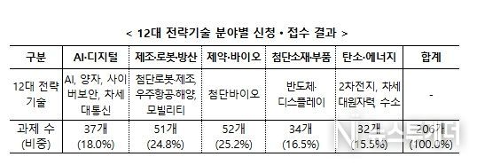 이번 공모는 12대 전략기술 분야를 중심으로 진행된 이번 공모는, 5대 전략기술 그룹 단위로는 제약·바이오 분야에 52개(25.2%), 제조·로봇·방산에 51개(24.8%), 인공지능(이하 AI)·디지털에 37개(18.0%) 등이 접수됐으며, 총 206개 접수 과제에 1,183개 기업·연구소 등이 참여 신청했다.
