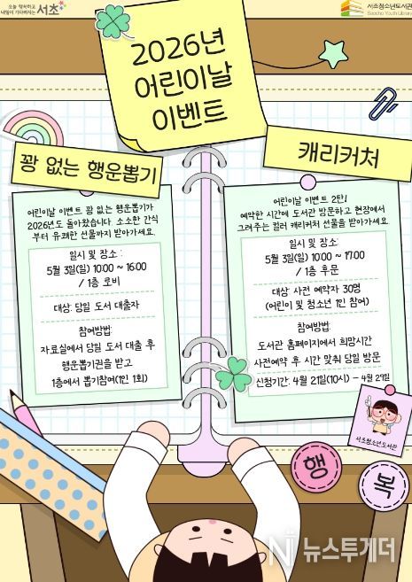 뉴스투게더 김인숙 기자 | 서울 서초구는 다가오는 어린이날을 맞아 다음달 3일 서초청소년도서관에서 어린이와 가족 모두가 즐길 수 있는 특별한 문화 행사를 개최한다. 이용자들을 위한 이벤트를 중심으로 일상 속 친숙한 도서관 만들기의 일환이다.