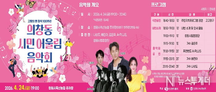 뉴스투게더 김인숙 기자 | 창원특례시는 오는 24일 19시 창원시축산농협 주차장(의창구 중동 402-2)에서 ‘의창동 시민 어울림 음악회’를 개최한다고 밝혔다.