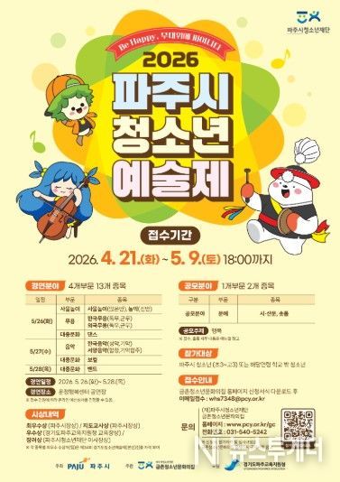 뉴스투게더 김인숙 기자 | (재)파주시청소년재단 금촌청소년문화의집은 오는 4월 21일부터 5월 9일까지 ‘2026 파주시청소년예술제’ 참가자를 모집한다고 밝혔다. 올해‘Be Happy, 무대위에 피어나다’를 부제로 개최되는 이번 예술제는 제34회 경기도청소년예술제 파주시 공식 예선으로, 파주시 청소년이라면 누구나 참가 신청이 가능하다.