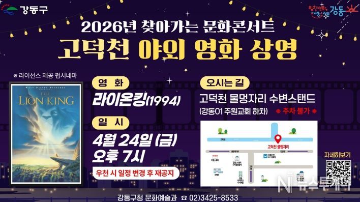 뉴스투게더 김인숙 기자 | 서울 강동구는 오는 24일 오후 7시, 고덕천 물멍자리 수변스탠드(주원교회 맞은편)에서 ‘2026년 찾아가는 문화콘서트’ 3회차 프로그램으로 미디어파사드를 활용한 야외 영화 상영을 진행한다고 밝혔다.