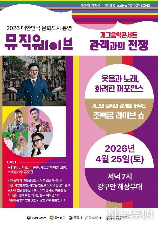 뉴스투게더 김인숙 기자 | (재)통영문화재단은 오는 25일 오후 7시 강구안 해상무대에서 2026년 뮤직웨이브 정기공연으로 음악과 개그의 경계를 허무는 특급 라이브쇼 개그음악콘서트 ‘관객과의 전쟁’공연을 진행한다.