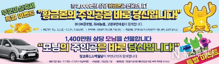 ‘황금몬을 선물합니다’는 부안군 대표축제 캐릭터 ‘부안몬 프렌즈’가 각인된 순금 3돈 상당의 카드형 골드바 6개를 제작해 부안 관내‧관외 3명씩 총 6명에게 추첨을 통해 증정하는 행사이며 ㈜DH글로벌, 하서농협, 고창부안축협의 후원을 받아 진행된다.