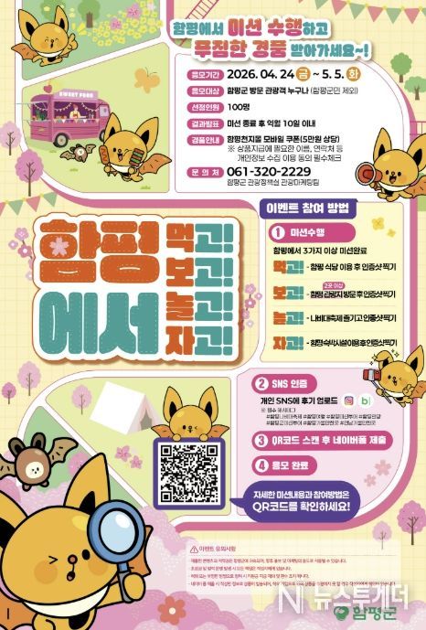 함평군은 “오는 24일부터 내달 5일까지 관광객을 대상으로 미션형 이벤트 ‘함평 먹보놀자(먹고·보고·놀고·자고) 미션투어’를 운영한다”고 22일 밝혔다.