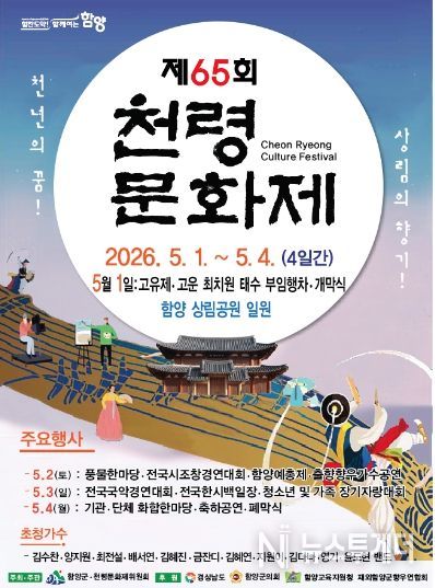 뉴스투게더 김인숙 기자 | 함양군을 대표하는 종합문화축제 ‘제65회 천령문화제’가 오는 5월 1일부터 4일까지 4일간 천년의 숲 상림공원 일원에서 열린다.